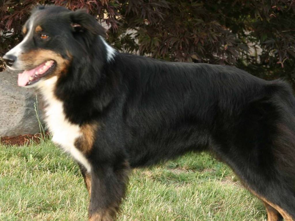 Что касается шерсти, она не очень длинная, но имеет густой подшерсток. Окрас шерсти или чёрно-подпалый, или двухцветный с подпалинами. Но главная отличительная черта цвета шерсти – белая маска на морде.